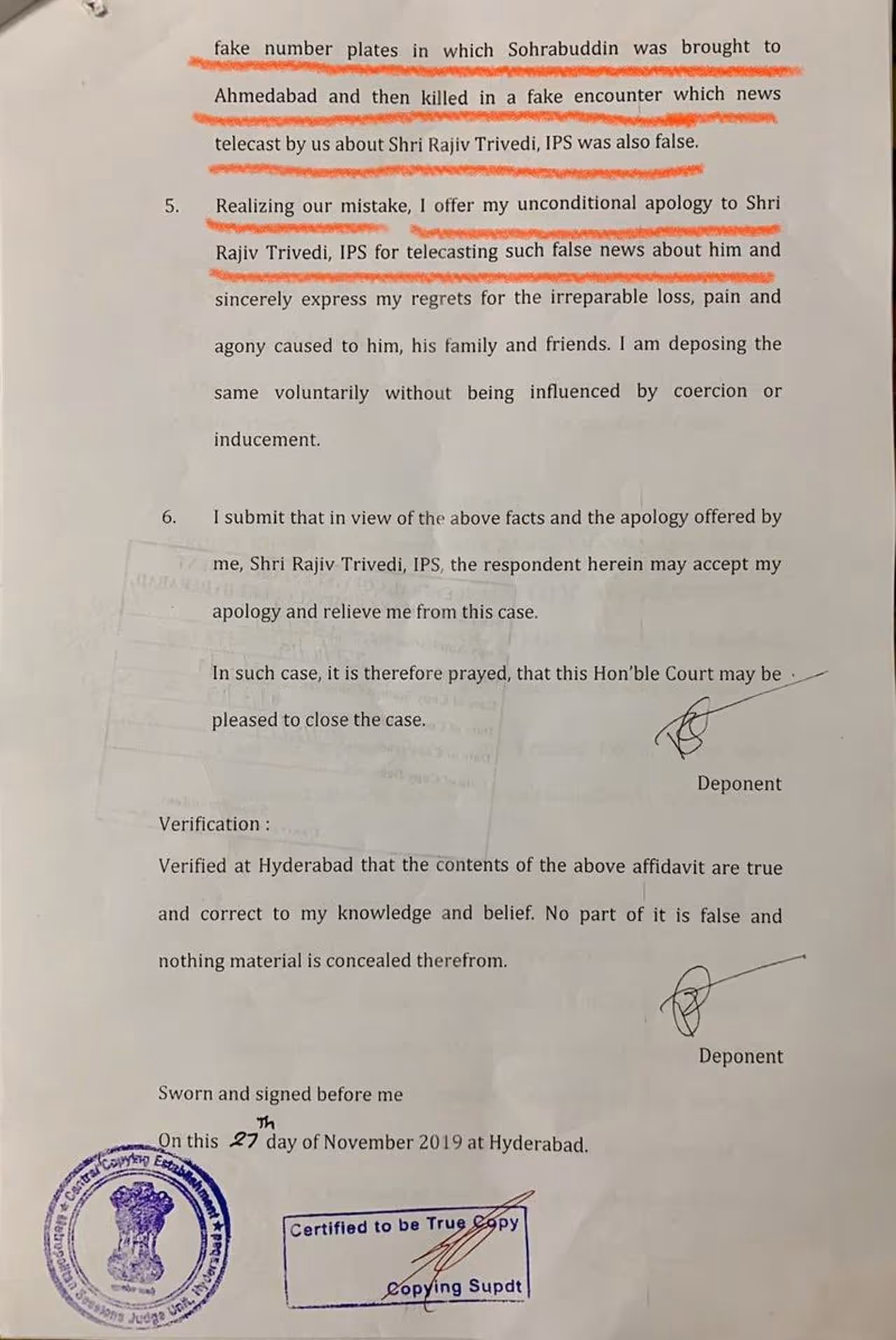 A Twitter user Alok Bhatt has once again exposed news peddler Rajdeep Sardesai as he posted pictures of how he went on to apologise for trying to spoil the reputation of a personality living dignifiedly in the society in the Sohrabuddin fake encounter case