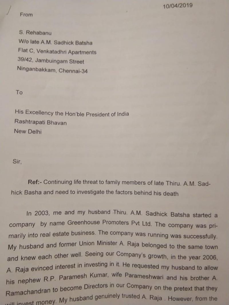 New Delhi: S Rehanabanu, the wife of Sadiq Basha, an associate of 2G spectrum case accused former Union minister A Raja, has written to President Ram Nath Kovind demanding a re-investigation into her husband’s death. Rehanabanu alleged her life is still under threat.
