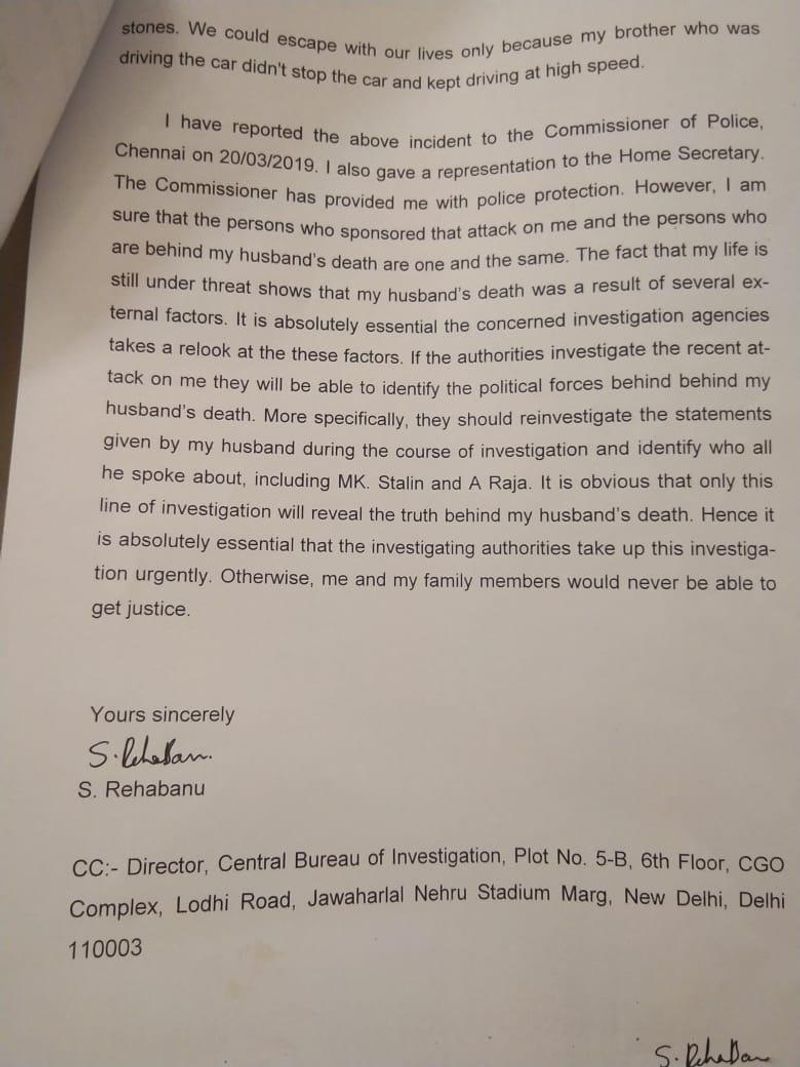 "More specifically, they should reinvestigate the statements given by my husband during the course of the investigation and identify who all he spoke about, including MK Stalin and A Raja," she demanded.