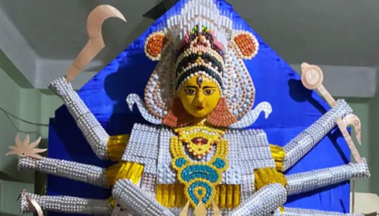 An artist from Assam has create a 6-foot-tall Durga idol from expired strips of tablets