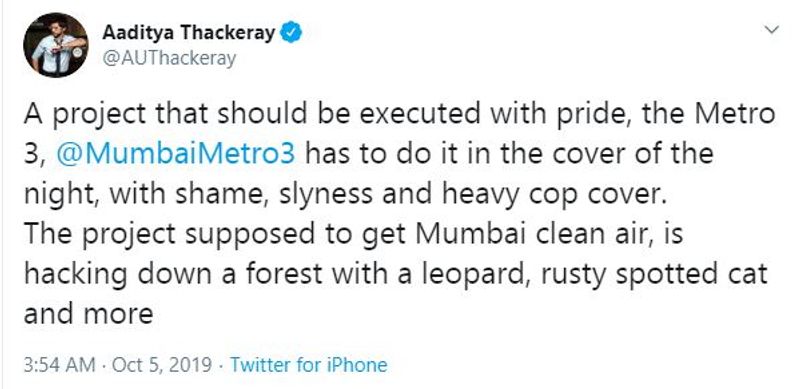 "A project that should be executed with pride, the Metro 3, @MumbaiMetro3 has to do it in the cover of the night, with shame, slyness and heavy cop cover. The project supposed to get Mumbai clean air is hacking down a forest with a leopard, rusty spotted cat and more," Aditya Thackeray tweeted.