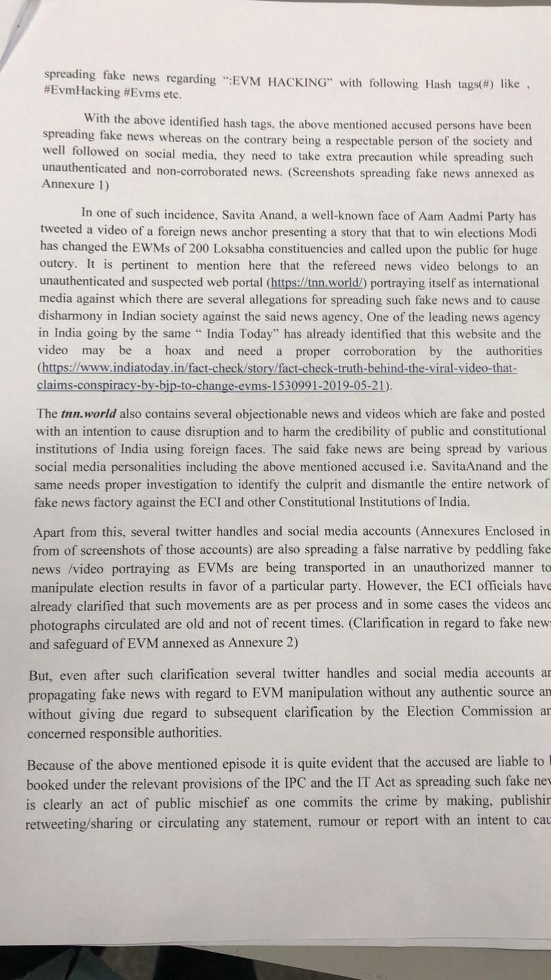 "It is pertinent to mention here that the refereed news video belongs to an unauthenticated and suspected web portal (https://tnn.world/) portraying itself as international media against which there are several allegations for spreading such fake news and to cause disharmony in Indian society against the said news agency, one of the leading news agency in India going by the same " India Today" has already identified that this website and the video may be a hoax and need a proper corroboration by the authorities (https://www.indiatoday.in/fact-check/story/fact-check-truth-behind-the-viral-video-that-claims-consviracv-bv-bip-to-change-evms-1530991-2019-05-21)," complaint says.