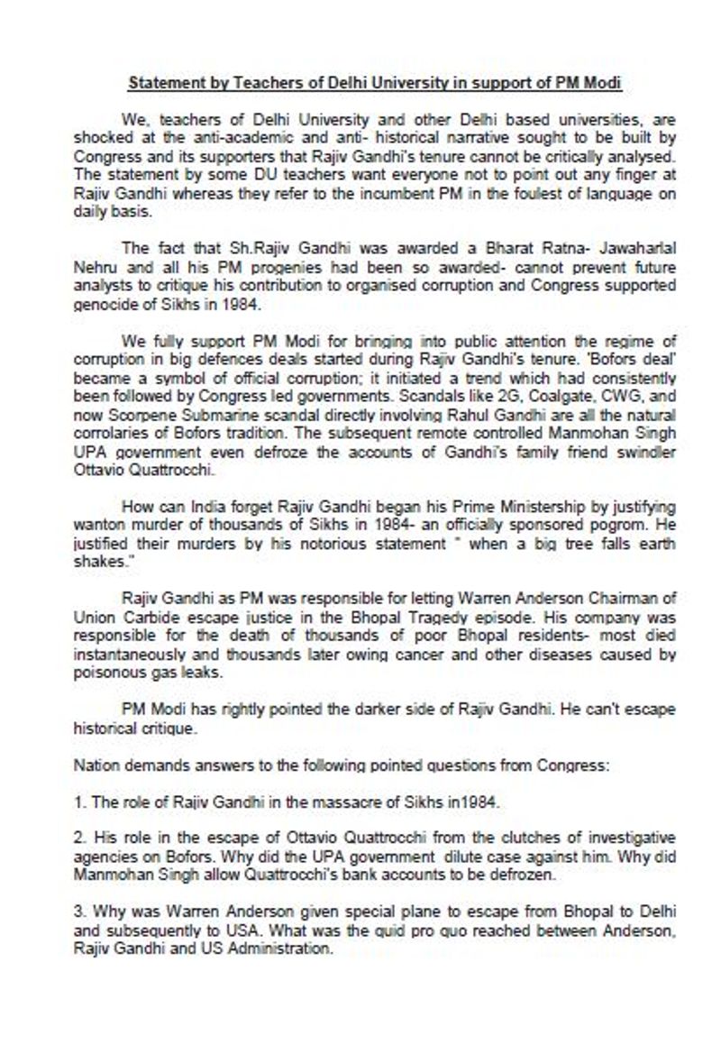 New Delhi: It is a tit for tat season this election. Everyone seems to be politically divided. If 200 odd Delhi teachers, in a scathing letter, criticised Prime Minister Modi for his 'Bhrashtachari no 1' comment against former PM Rajiv Gandhi, now 600 teachers have come forth and written a letter in support of him. Academicians of Delhi University and other Delhi based Universities like the JNU, GGSIPU, JMI have appealed to the general public and have asked them to vote for NDA.