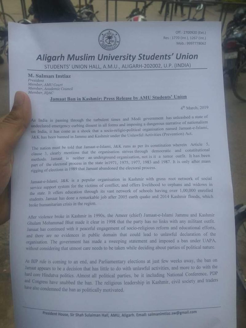 In a letter issued by AMU Students' Union (AMUSU) president Salman Imtiaz on the organisation’s letterhead, the students body lamented the ban against what it considers to be a “popular organisation in Kashmir with grassroots network of social service support system for the victims of conflict, and offers livelihood to orphans and widows in the state”.
