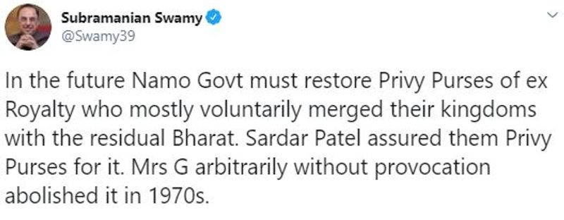 BJP Rajya Sabha MP Subramanian Swamy has called for the reinstatement of privy purses given to the princely states who merged with India after Independence in 1947. The call for restoration comes soon after the abolition of Article 370