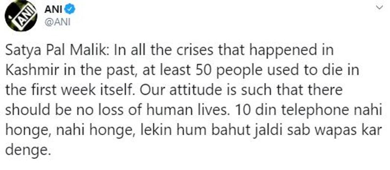Now, the Governor of Jammu and Kashmir, Satya Pal Malik, has said that even though communication lines have suffered, but there is no loss of human lives.