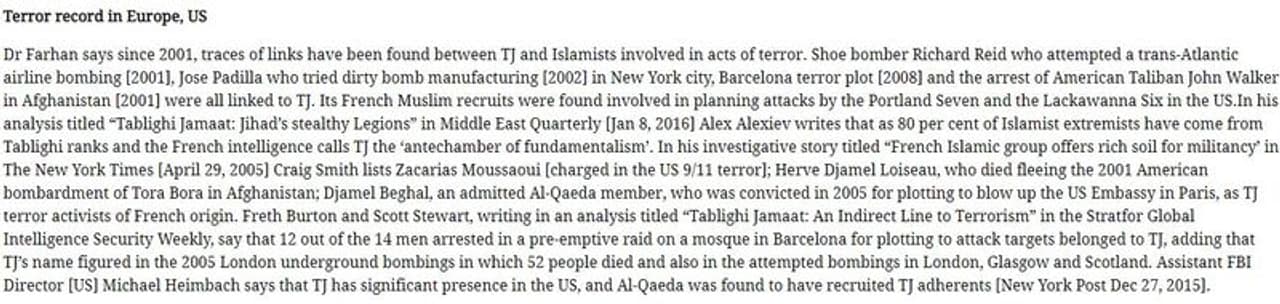 Under another header “Terror record in Europe, US” the journalist exposes, with the hep of Dr Farhan, how “traces of links have been found between TJ and Islamists involved in acts of terror. Shoe bomber Richard Reid who attempted a trans-Atlantic airline bombing [2001], Jose Padilla who tried dirty bomb manufacturing [2002] in New York city, Barcelona terror plot [2008] and the arrest of American Taliban John Walker in Afghanistan [2001] were all linked to TJ.”