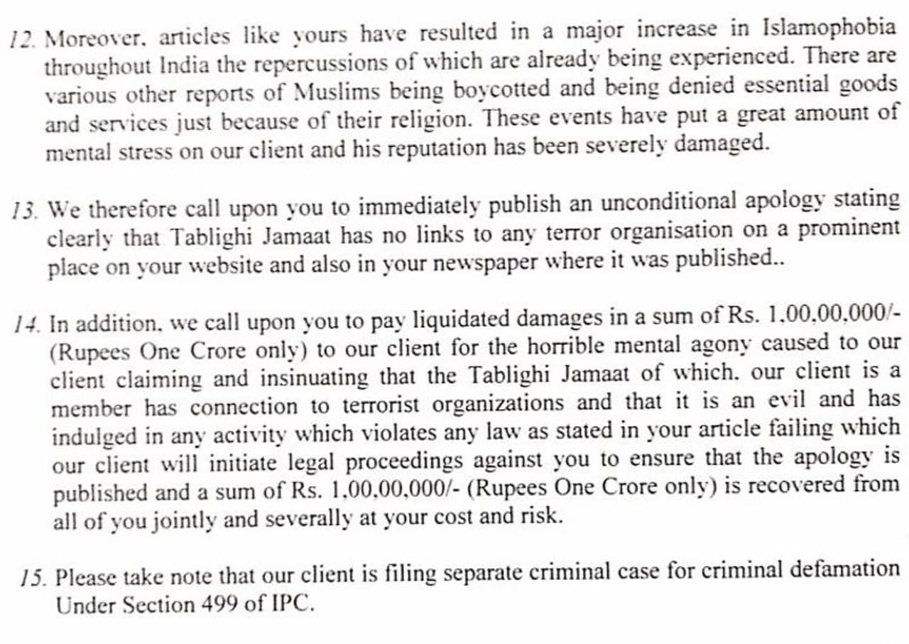 A legal notice was sent to The New Indian Express for publishing an article written by S Gurumurthy titled Tablighi Jamaat - its other, evil side, which exposes the Tablighi Jamaat for defamation charges of Rs 1 crore. In its reply, the TNIE’s lawyers have maintained that the article published was in good faith, supported by facts and figures.