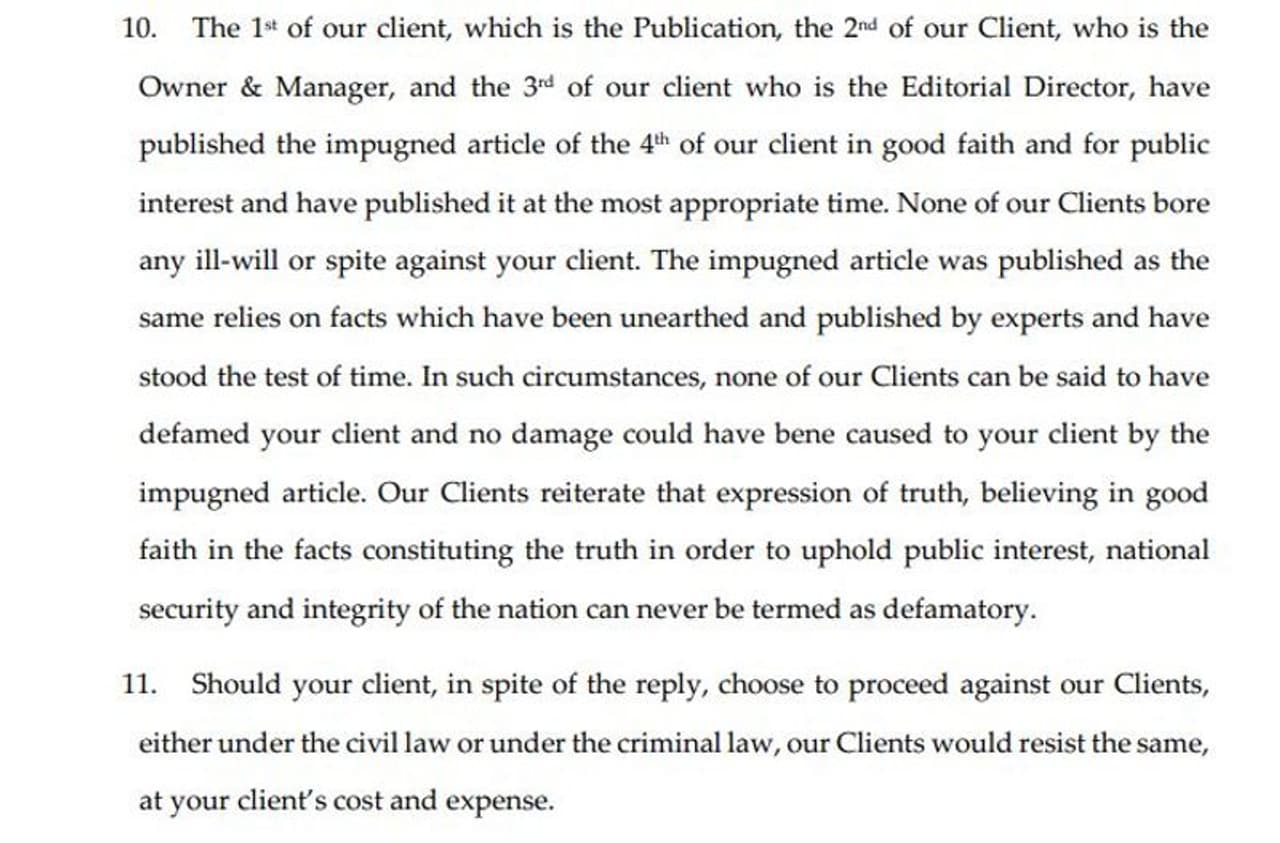 While the legal notice was sent, the Indian Express has replied to the legal notice, saying ”they have published the impugned article of the 4th of our client (Gurumurthy) in good faith and for public interest and have published it at the most appropriate time. None of our Clients bore any ill-will or spite against your client. The impugned article was published as the same relies on facts which have been unearthed and published by experts and have stood the test of time.”