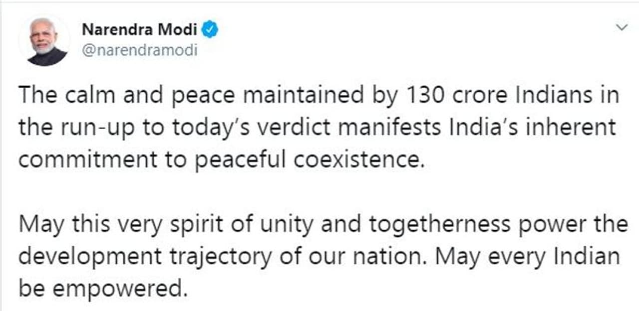 "The calm and peace maintained by 130 crore Indians in the run-up to today’s verdict manifests India’s inherent commitment to peaceful coexistence. May this very spirit of unity and togetherness power the development trajectory of our nation. May every Indian be empowered," PM added.