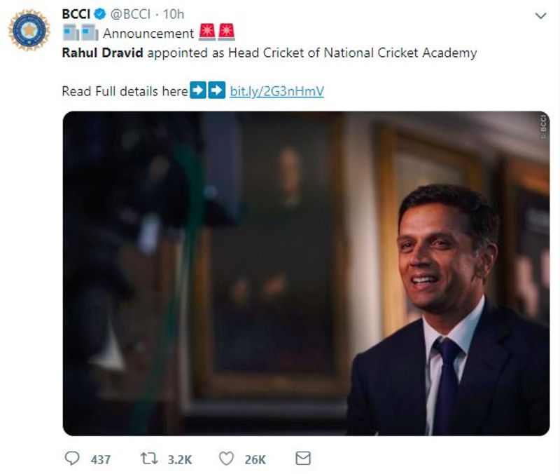 The BCCI did not specify the tenure of appointment for Dravid, who will also be responsible for monitoring progress of the developmental teams and provide necessary inputs on the same to the senior men's and women's head coaches.