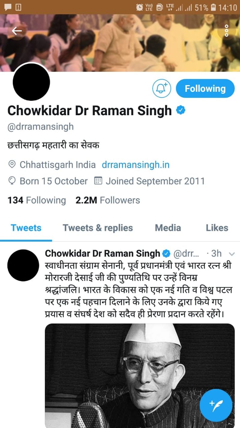 The profile photo in the official Twitter handle of BJP Chhattisgarh has been changed to black. BJP leaders from across the state have also blackened their profile pictures on social media as protest against yesterday's naxal attack.
