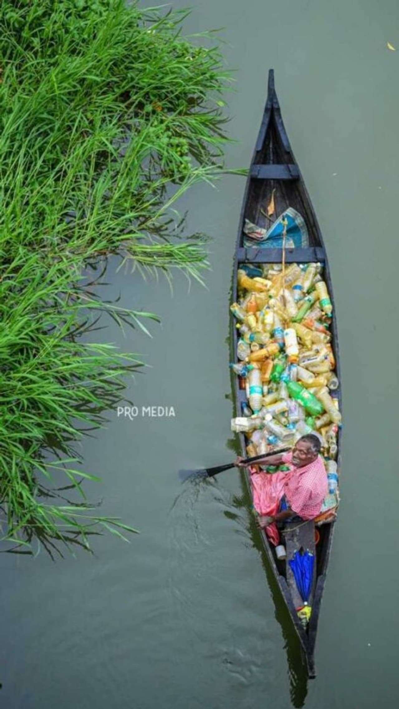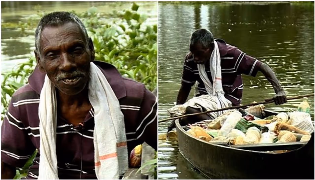 69-year-old Rajappan collects discarded plastic from Vembanad lake