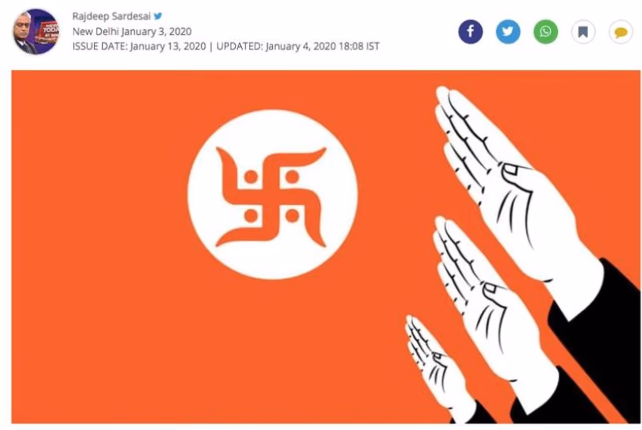 In a tweet, journalist Rajdeep Sardesai put out a picture containing a picture of the holy Swastika with a saffron background to resemble that of the Nazis, with a three-palm salute, probably to convey that Hindutva is taking over