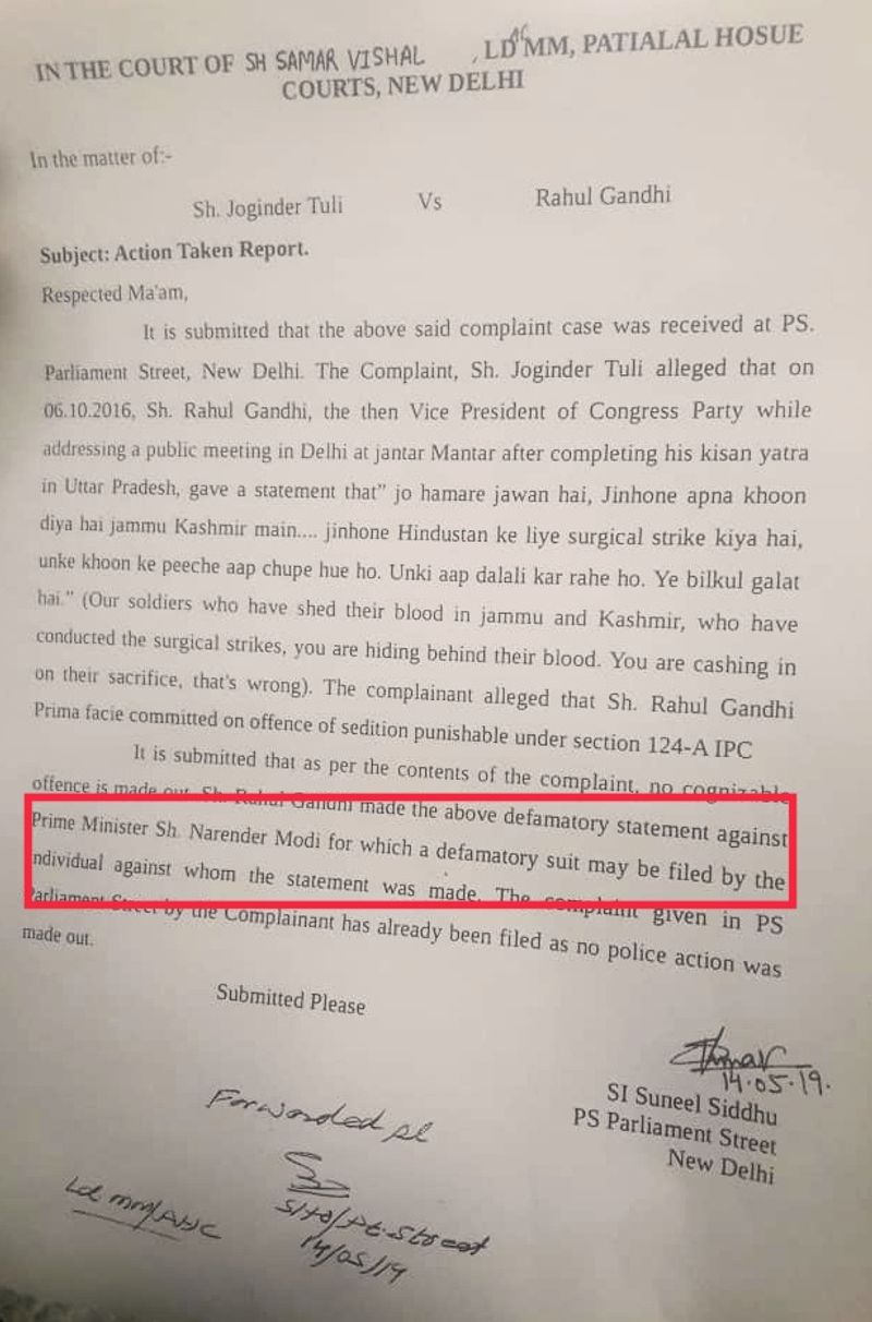 “Sh Rahul Gandhi made the above defamatory statement against Sh Prime Minister Narendra Modi for which a defamatory suit may be filed by the individual against whom the statement was made,” the report added.