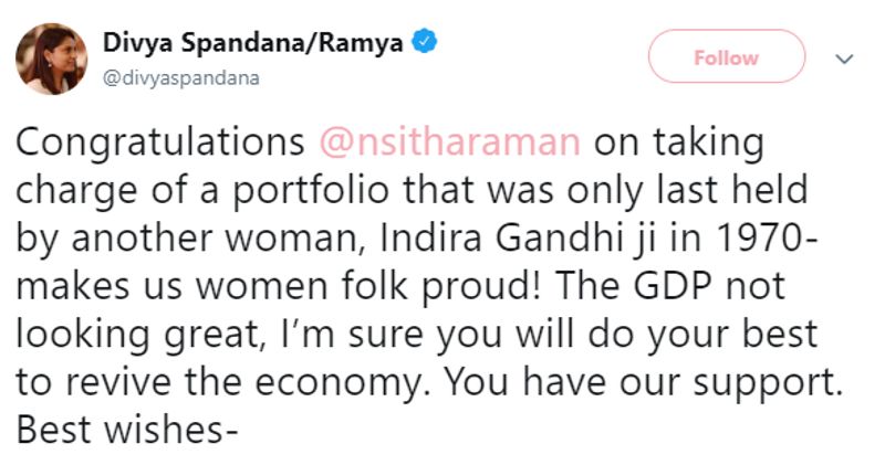 In the last tweet before deleting her account, Spandana both curiously and interestingly congratulated Nirmala Sitharaman on assuming charge as the finance minister, the second woman to take care of the ministry since independence.