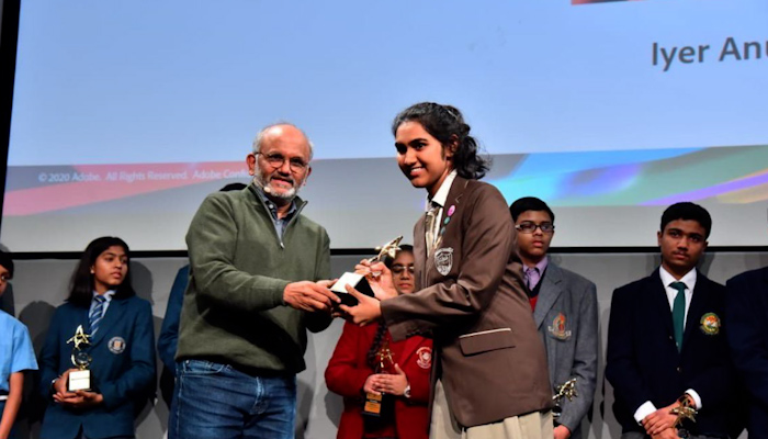 Anushri Iyer winning second place in the CBSE Adobe Creativity Challenge and being felicitated by Mr. Shantanu Narayen, Chairman/CEO of Adobe Inc USA, at the Adobe headquarters in Noida, Delhi, February 2020