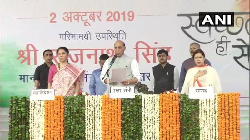 Delhi: Defence Minister Rajnath Singh administered a cleanliness oath to people at an event organised in Delhi Cantonment on #GandhiJayanti
