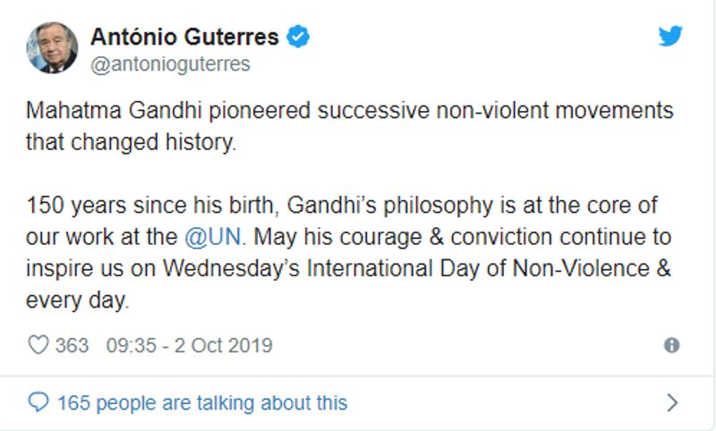 UN Secretary General Antonio Guterres paid tribute to Mahatma Gandhi who is followed by people across the world for propagating the message of non-violence and peace.