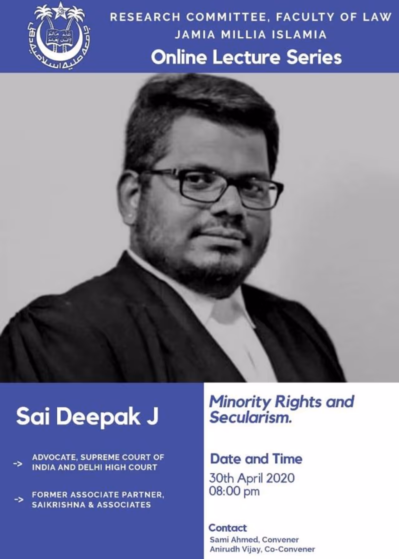 Despite the confirmation, on the 30th of April, the day the lecture was set to take place, the Law Faculty of Jamia Millia Islamia University cancelled the lecture by J Sai Deepak.