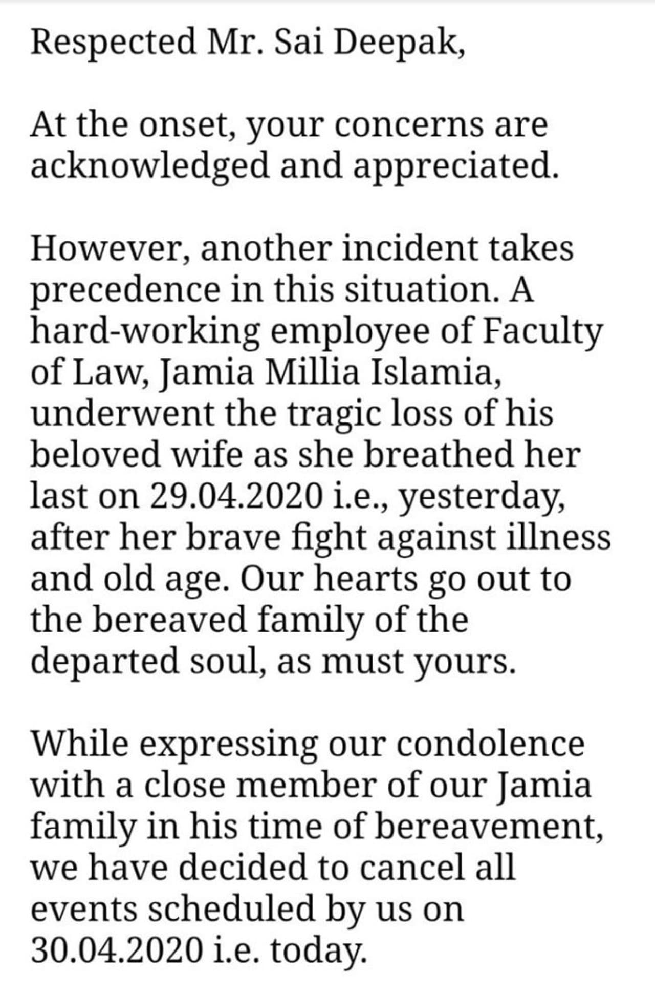 While the notice by Jamia to its students did not provide any reason for the cancellation of the lecture, an email sent to Sai Deepak stated that his lecture was being cancelled because the wife of an employee of the Law Faculty of Jamia had passed away due to old age.