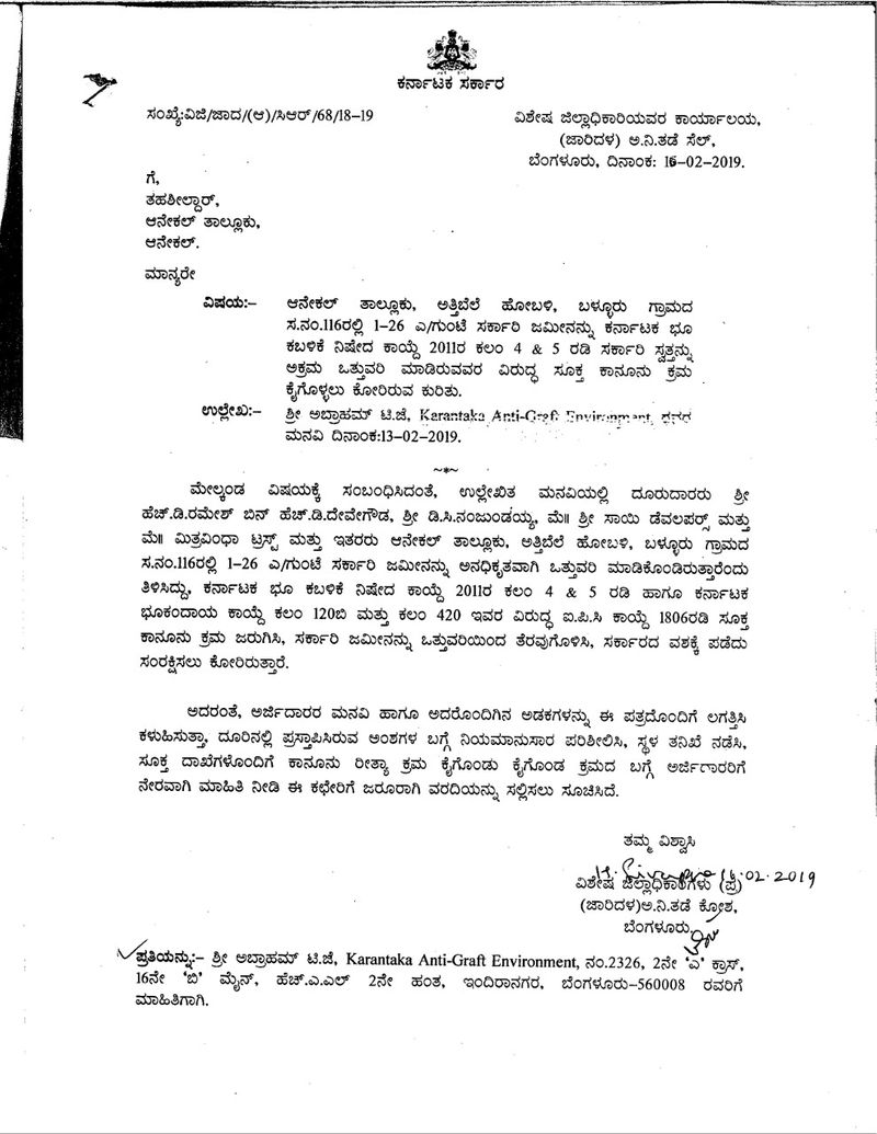 Cases have been filed under sections 4 and 5 of Karnataka Land Grabbing Act 2011, sections 5 and 6 of Karnataka Public Premises (Eviction of Unauthorised Occupants) Act 1974, 192-A, 192-B, 192-C, of the Karnataka Land Revenue Act 1964 and section120 B and 420 of the Indian Penal Code.