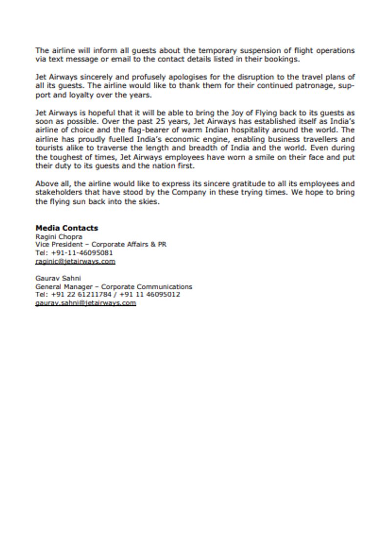 The document added, “Since no emergency funding from the lenders or any other source is forthcoming, the airline will not be able to pay for fuel or other critical services to keep the operations going. Consequently, with immediate effect, Jet Airways is compelled to cancel all its international and domestic flights. The last flight will operate today.”