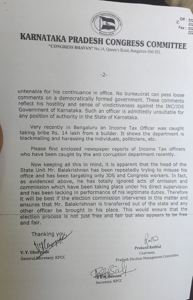 The Congress said the I-T department targeted the members of the Congress and JD(S). The party wants I-T chief of Karnataka circle, Balakrishnan to be transferred to ensure free and fair election in the state