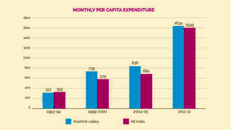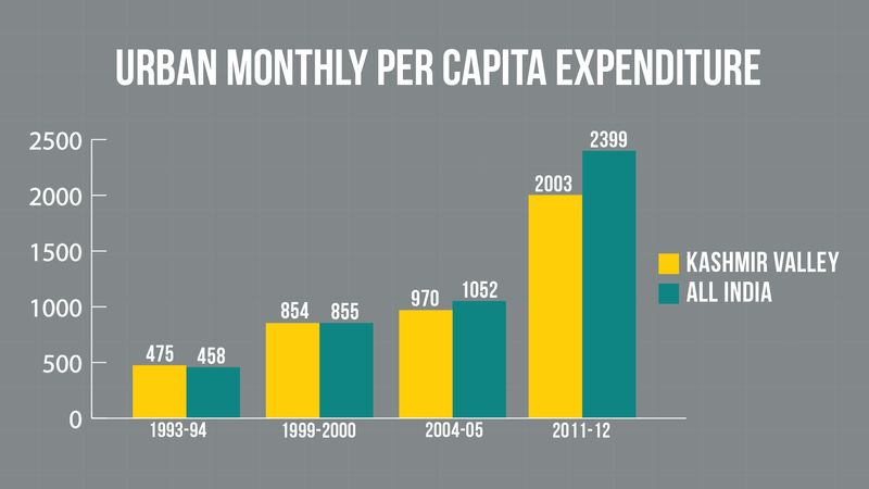 According to Observer Research Foundation, which studied the Household Consumer Expenditure Surveys conducted by National Sample Survey Office (NSSO), consumer expenditure (acquisition of goods and services by individuals or families) of people in the Valley not only increased but also surpassed the national average from 1999-2012