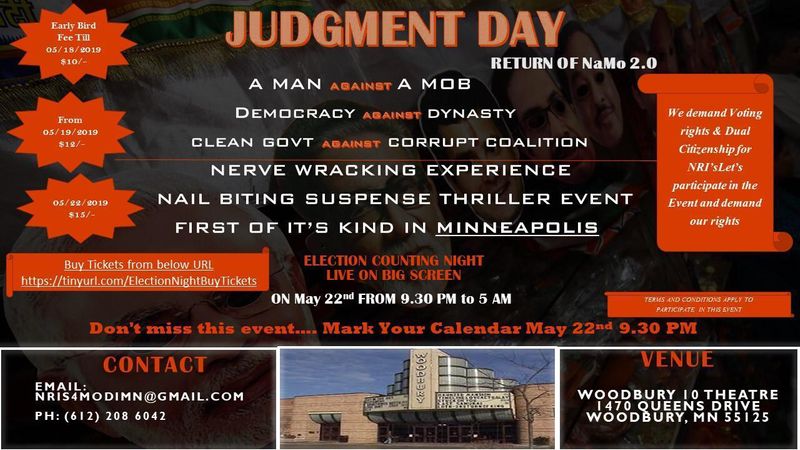 Organised by a committee called the NRI Political Action Committee, there will be a live broadcasting of the counting, and the final results between 9-30 pm and 5 am on May 22. The venue is - Woodbury10 Theatre, Woodbury, Minnesota.