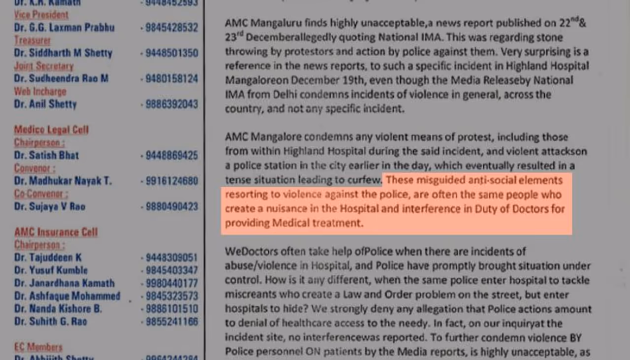 Bengaluru: The Association of Medical Consultants, Mangaluru has strongly stood in support of the Mangaluru police as they tried and are trying to maintain peace in the coastal town.