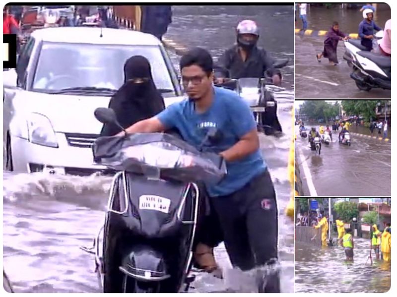 Police & Brihanmumbai Municipal Corporation (BMC) workers help bikers cross waterlogged roads in King's Circle area of Mumbai.