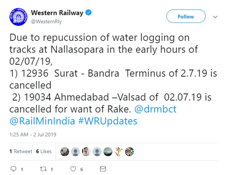 Western Railway: There's no disruption on Western Railway. Trains are running normal between Churchgate and Virar. Water level has come down on all 4 lines at Nallasopara. Trains are running with some delay due to low visibility due to heavy rains