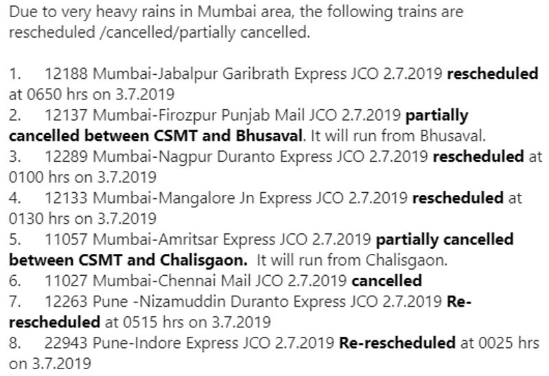 Sunil Udasi, Chief Public Relations Officer, Central Railway: Due to very heavy rains in Mumbai area, the following trains are rescheduled /cancelled/partially cancelled.
