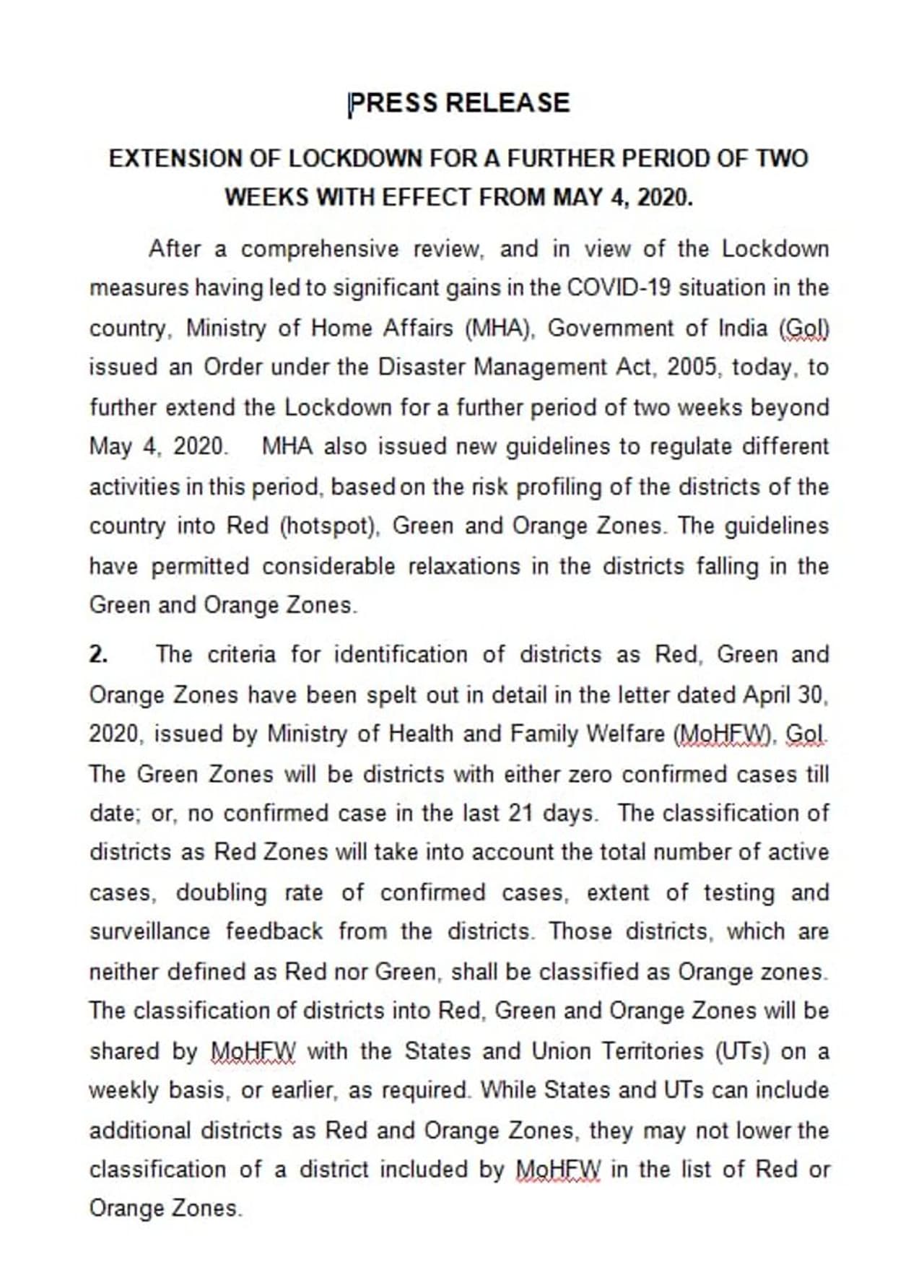 The Ministry of Home Affairs said that economic activity with restrictions will be allowed in green and orange zones as per earlier directions.
