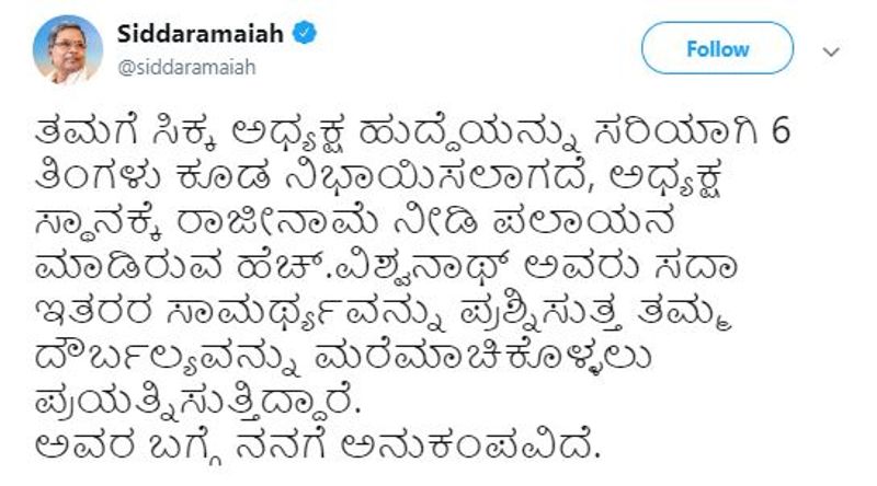 Siddaramaiah, former Karnataka CM, has mocked H Vishwanath, a JD(S) senior leader for his inability to continue as the state president of the party