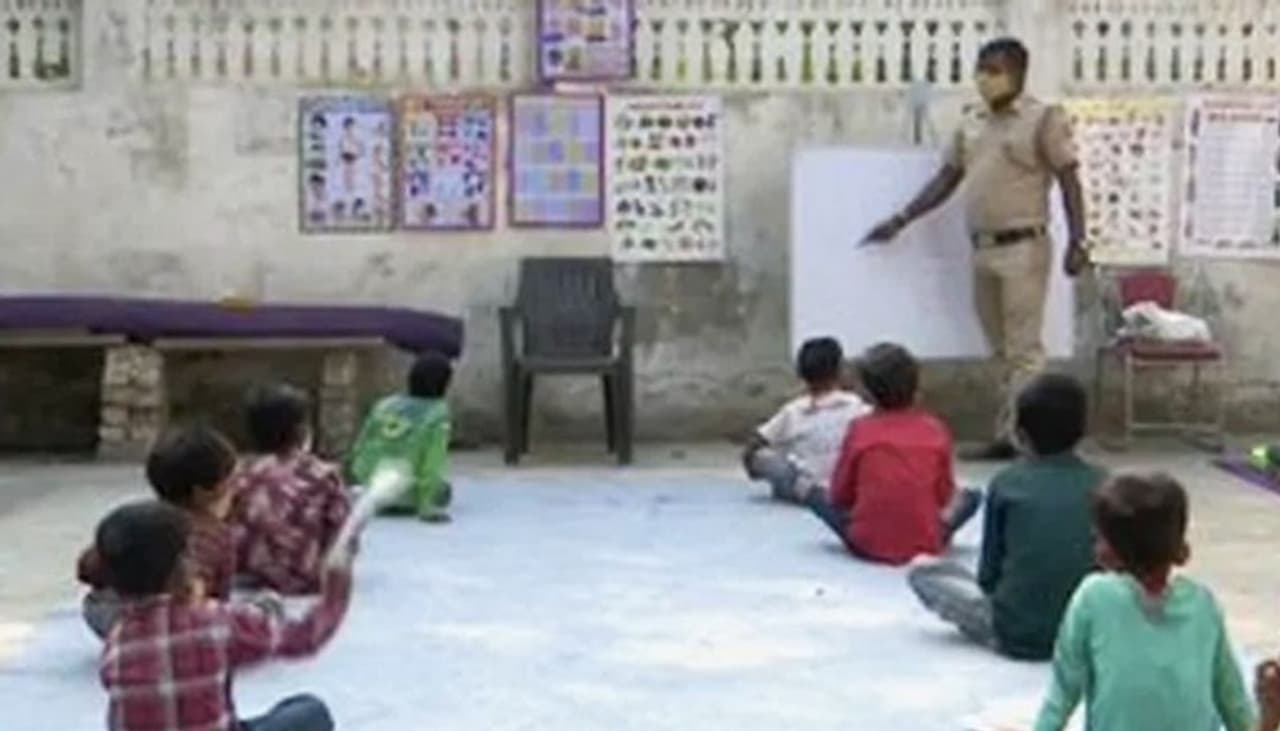 A Delhi police constable Than Singh takes classes for kid belonging to the economically backward classes, keeping in mind COVID-19 health hygiene protocols