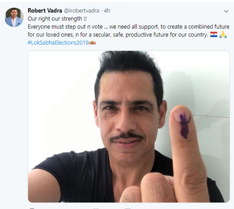 Robert Vadra took to Twitter to say, “Our right our strength !! Everyone must step out n vote ... we need all support, to create a combined future for our loved ones, n for a secular, safe, productive future for our country"