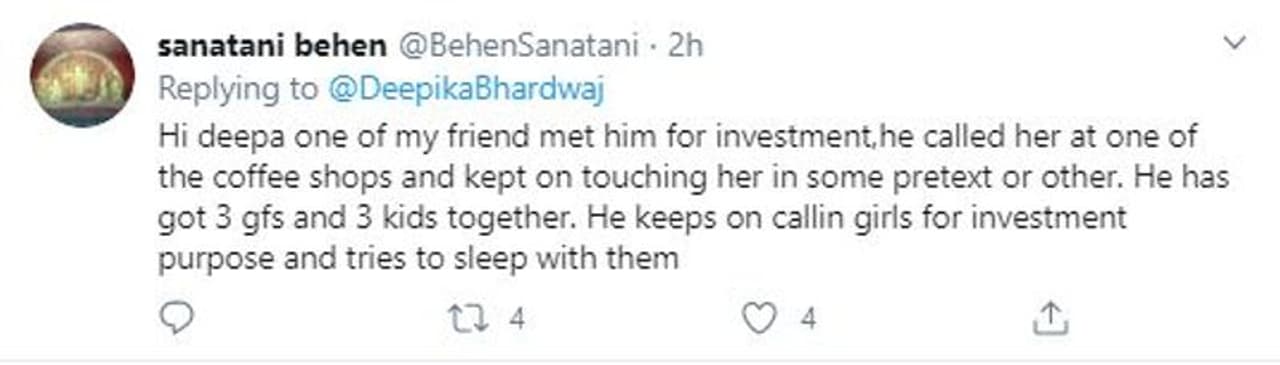 The stories also revealed transgressions of the investor against authors, reporters, HR manager and woman executive in IT firms.