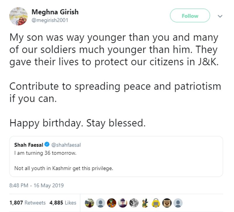 Shah Faesal, chief of Jammu and Kashmir People's Movement tweeted cynically while mentioning that he was celebrating his birthday in Kashmir, only to get a heartfelt reply from Meghana Girish - mother of Akshay Girish who was martyred in Nagrota, Jammu in 2016.