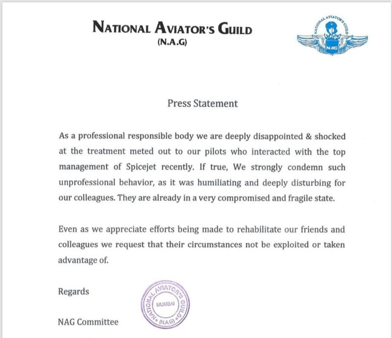 National Aviators’ Guild (NAG), the airline’s pilots union, released a statement to express their 'disappointment and shock'. The release says, "...we are deeply disappointed & shocked at the treatment meted out to our pilots who interacted with the top management of SpiceJet recently. If true, we strongly condemn such unprofessional behaviour, as it was humiliating and deeply disturbing for our colleagues. They are already in a very compromised and fragile state".