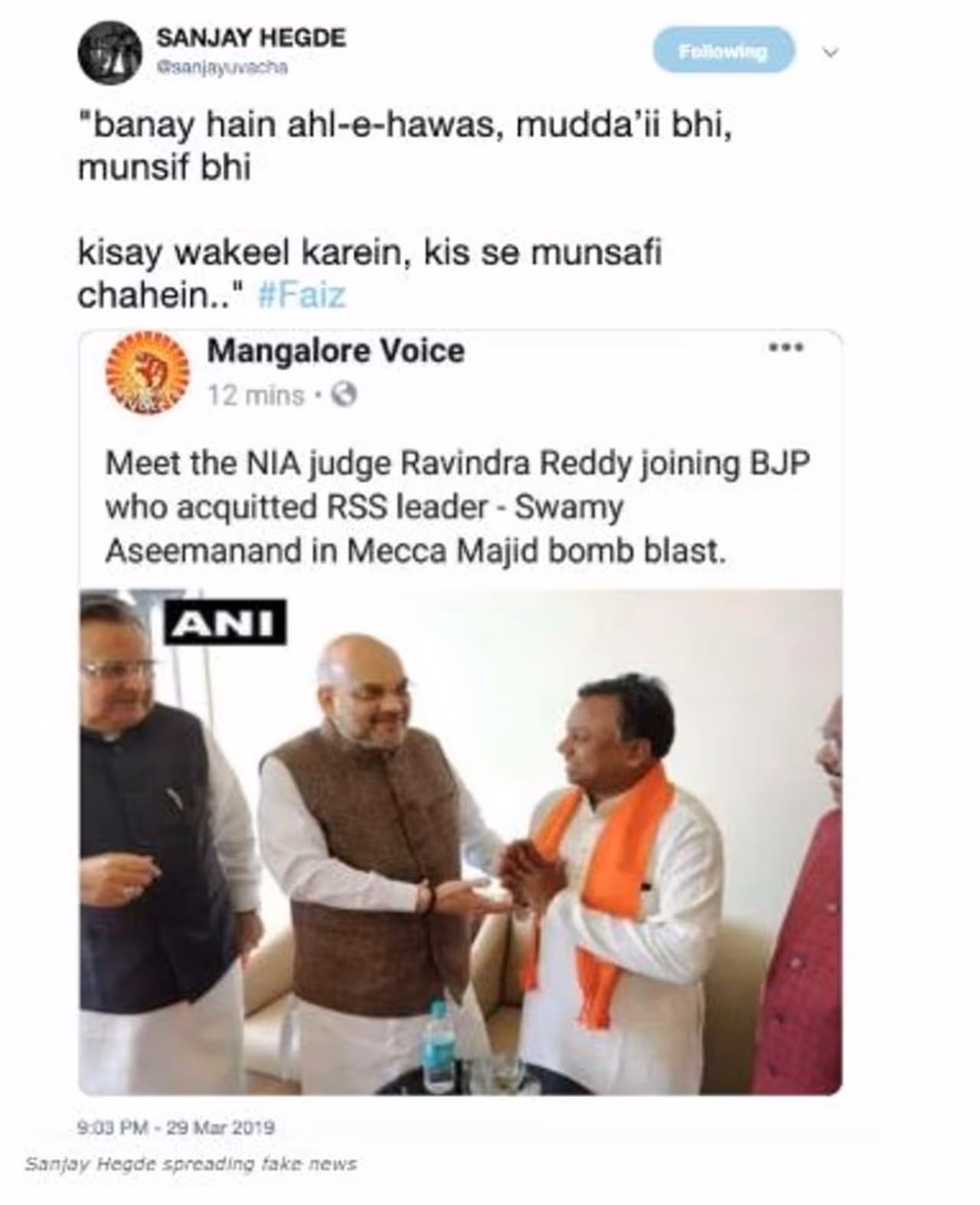 Once such fake news pertained to NIA judge Ravindra Reddy joining BJP. It was he who acquitted RSS leader – Swamy Aseemanand in Mecca Majid bomb blast.