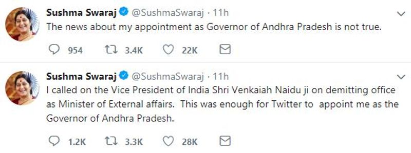 Moments later Swaraj tweeted, "The news of my appointment as Governor of Andhra Pradesh is not true".