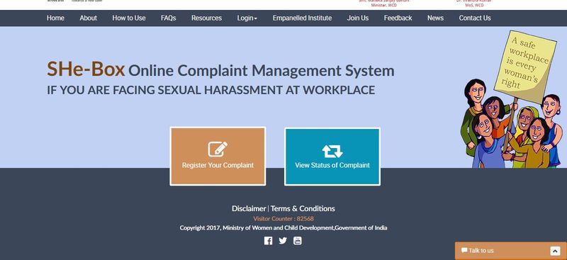 The Sexual Harassment electronic Box or SHe-Box provides every woman, irrespective of work status or work sector, to register a sexual harassment complaint. Once the complaint is filed, the concerned authority of the jurisdiction will take action.