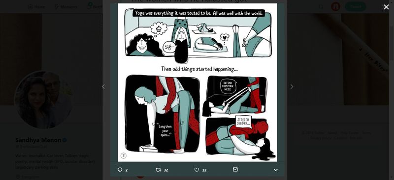 Writer Sandhya Menon took to Twitter to share the illustrations writing, "Here's a story about a sexual harasser, Mohan Polamar, who is also a yoga teacher. Oh, the access. This is the couple who runs The Practice Room in Wheeler Road, Bangalore. The women who he harassed got together and created this comic."