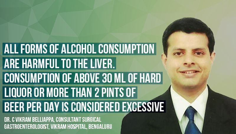 Dr C Vikram Belliappa, consultant surgical gastroenterologist, Vikram Hospital Bengaluru, says "New research shows all forms of alcohol consumption is harmful to the liver. Consumption of above 30 ml of hard liquor or more than 2 pints of beer per day is considered excessive."