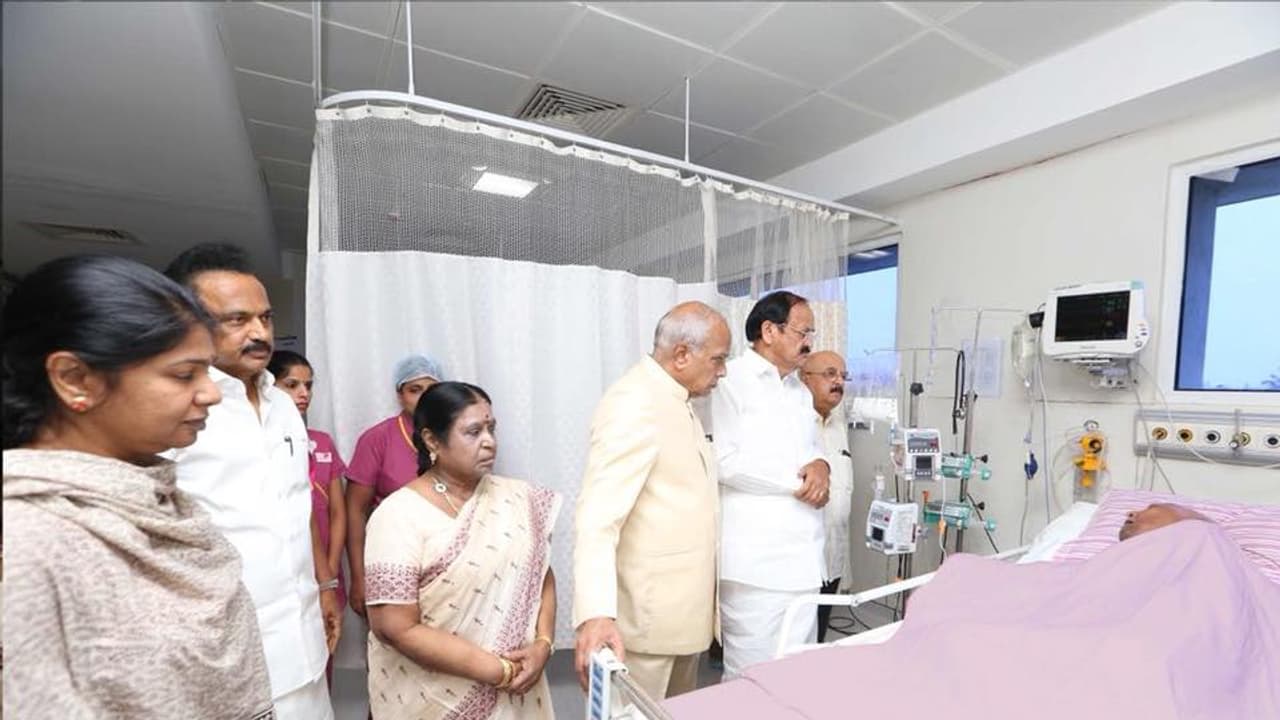 Karunanidhi was hospitalised in the wee hours yesterday after his blood pressure dropped. He had undergone a procedure at the Kauvery Hospital for replacement of a tracheostomy tube to help him breathe normally.