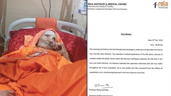 Chennai: Siddaganga Mutt seer Shivakumara Swami has been admitted to Dr Rela Institute and Medical Centre in Chennai. The 111-year-old seer was airlifted to Chennai and underwent liver bypass surgery. Dr Mohammed Rela conducted the surgery and has advised eight to ten weeks of rest. The Siddaganga seer looked healthy even after two hours of surgery. The seer is said to have asked his disciples to take him back to the Mutt.