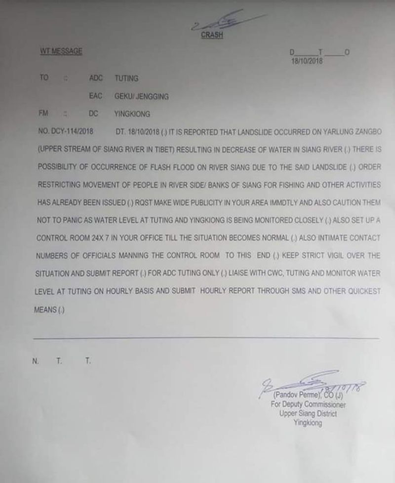 As a preventive measure, the administration advised the people to refrain from venturing into River Siang or even its catchment areas for collection of firewood, fishing, bathing etc.