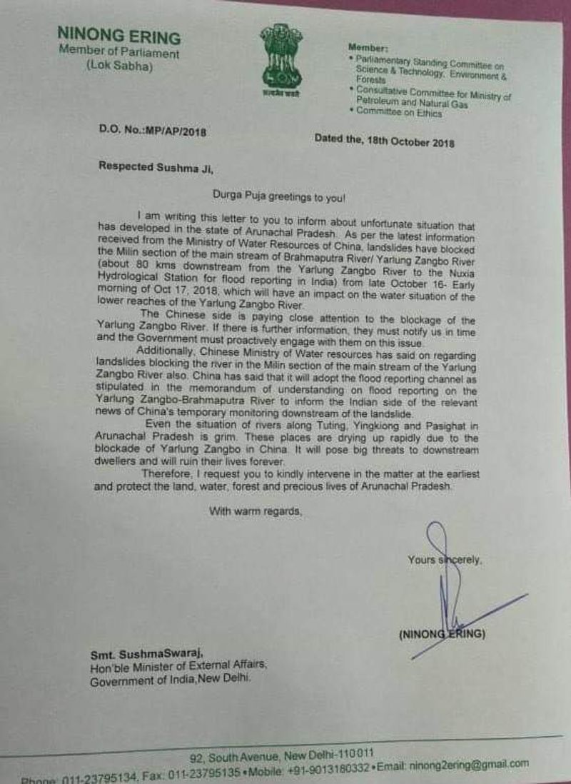 MP Ninong Ering of the Congress has written a letter to external affairs minister Sushma Swaraj, urging her to find out why China did not alert India using the flood information channel mutually agreed upon, as the blockade on the Yarlung Tsangpo caused by a landslide threatens to cause flash floods in the Siang stretch of Arunachal Pradesh and/or the Brahmaputra stretch of Assam